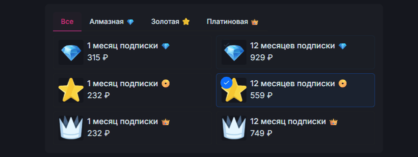 Дальше идут платные подписки: Золотая , Платиновая и Бриллиантовая: