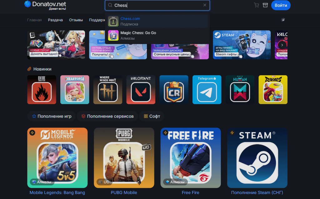 Шаг 1. Перейдите на официальный сайт сервиса по ссылке https://donatov.net/. На главной странице воспользуйтесь поиском или каталогом игр, чтобы найти Chess и открыть страницу с доступными вариантами подписки.