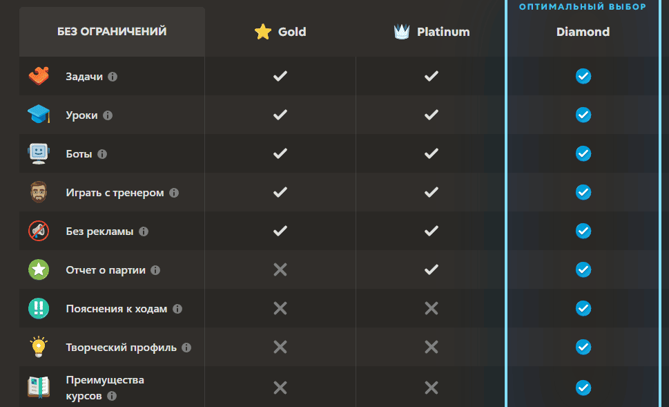 - Бриллиантовая — максимальный уровень. Он включает полный доступ ко всем функциям: продвинутый анализ партий, обучающие видео, персонализированные уроки, максимально широкий набор тренировочных инструментов и профиль без ограничений.