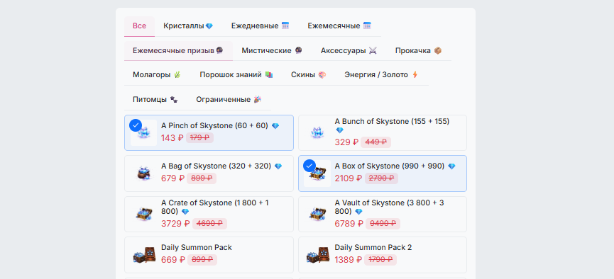 | A Bunch of Skystone | Малый пакет Skystone (Небесных камней) (310 шт.) | 449 рублей |