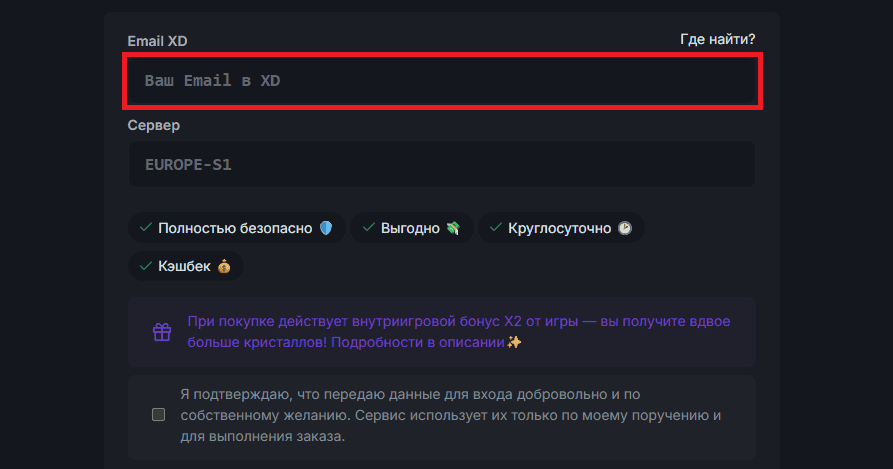 Шаг 4. Указываем электронную почту, которая привязана к аккаунту XD. Это критически важный момент: перед оформлением заказа обязательно удостоверьтесь, что почта точно закреплена за вашим профилем (инструкция по привязке находится ниже).