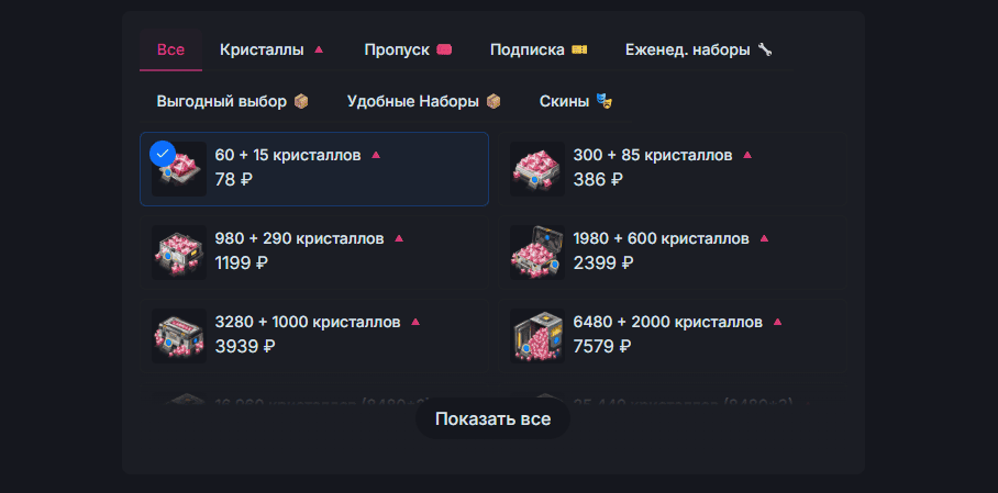 Шаг 2. Выбираем нужный пакет кристаллов или любой другой донат-набор из доступных вариантов (например, мы выбрали 60 + 15 кристаллов за 78 рублей).