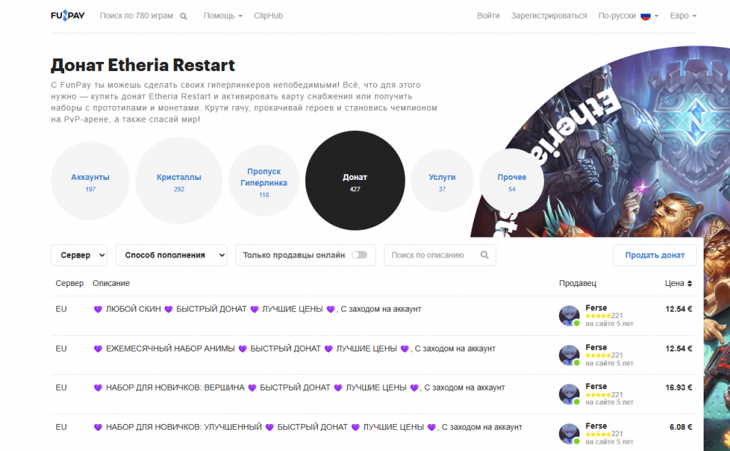 Donatov.net — это онлайн-маркет, с помощью которого можно безопасно покупать донат в популярных играх, в том числе Etheria Restart. Площадка поддерживает привычные для игроков способы оплаты и заточена именно под покупку игровой валюты и наборов.