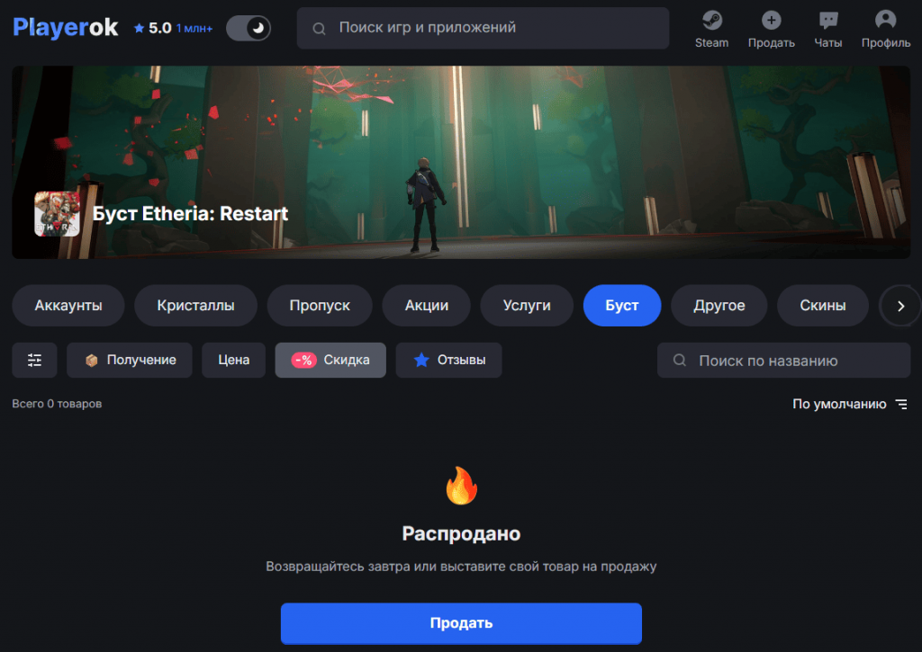 На площадке очень мало предложений для Etheria Restart — в основном только готовые аккаунты, одиночный лот с кристаллами, остальное помечено как «Распродано». Услуг по фарму и прокачке на момент написания статьи здесь нет вообще. Зато вам помогут изменить свой голос в войс-чате на женский.