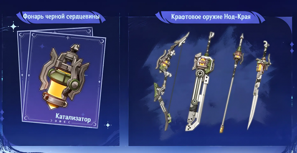 Чтобы создать катализатор, требуется чертёж, материалы кузнечного дела и редкие ресурсы региона Нод-Край. Оружие подходит для магов-реакционеров, способных извлечь выгоду из увеличенного урона элементальных реакций. Фонарь чёрной сердцевины сочетает эстетику древнего света с функциональностью современного оружия.