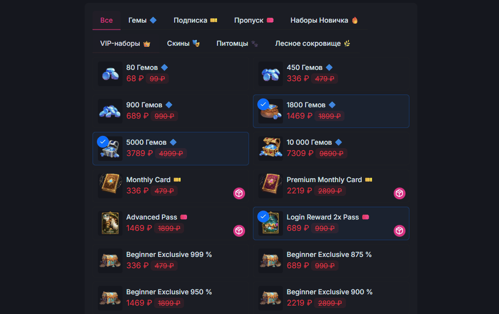 | Monthly Card (Месячная карта) | Базовая подписка на 30 дней: даёт ежедневные Гемы, стартовые бонусы и дополнительные ресурсы при входе в игру. Выгодна для регулярной игры. | 479 рублей |