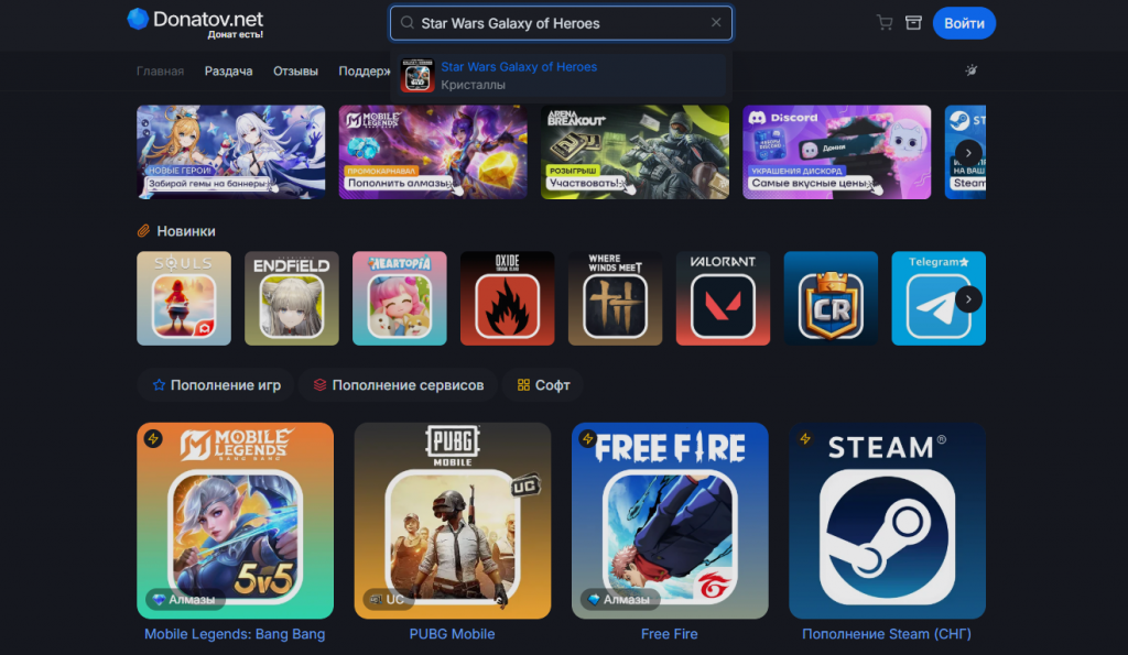 Шаг 1. Перейдите на официальный сайт сервиса https://donatov.net/ и найдите в каталоге игру Star Wars Galaxy of Heroes. Быстрее всего сделать это через поисковую строку в верхней части сайта. После этого откройте страничку игры.