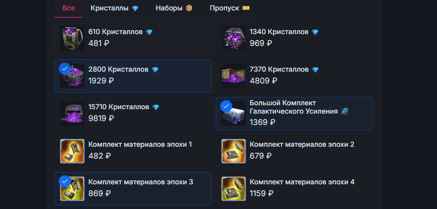 | Галактические комплекты | Крупные наборы ресурсов и усилений, предназначенные для ускоренного развития персонажей и кораблей. | от 1319 рублей |